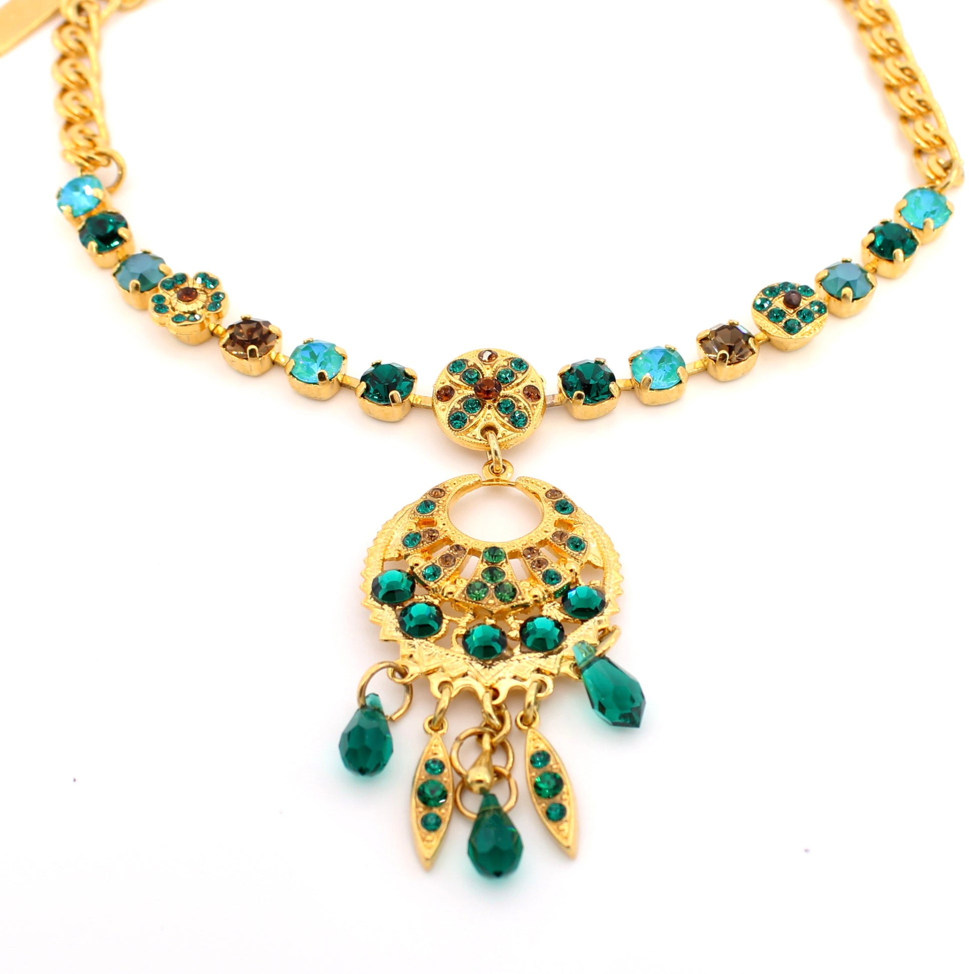 Necklace features pear and marquise crystals and a semi precious stone and is approximately 17 inches long, lobster claw closure.